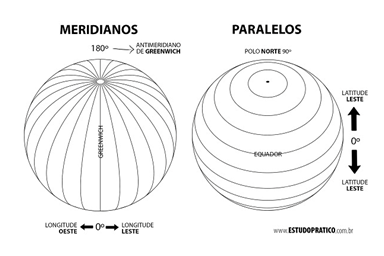Coordenadas geográficas – Conjunto de linhas imaginárias traçadas sobre os mapas e globos que representam a superfície da Terra. Essas linhas são chamadas de Meridianos e Paralelos.